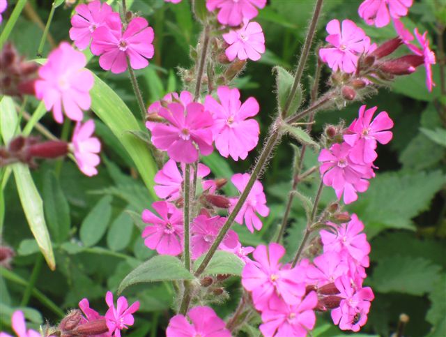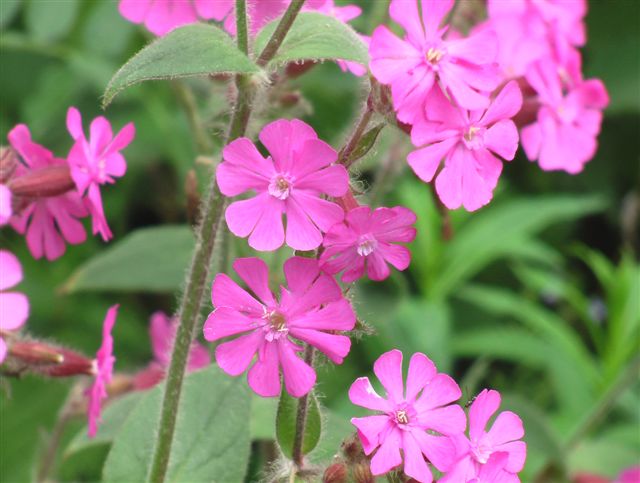 Plante vivace, haute de 80cm, tige rude couverte de poils dressés, feuilles ovales à spatulées, fleurs rose vif aux cinq pétales très échancrées .