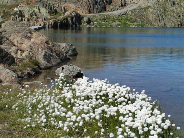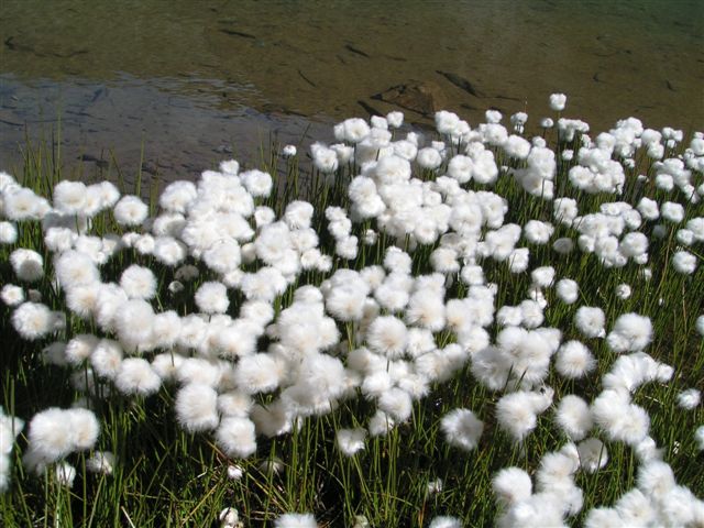 C'est la plante en fruit qui attire l'attention, plus exactement un groupement qui interpelle le promeneur et signale le lac ou la zone humide d'altitude . C'est un ensemble de plumets blancs, groupés en boules assez fournies sujettes à une agitation sporadique sous l'effet de quelque brise. Les tiges lisses et rondes s'habillent seulement de quelques feuilles engainantes.