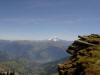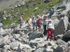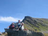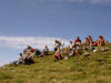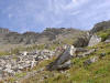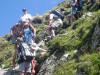 Au pied du Roc Blanc nous nous divisons en deux groupes. Le premier ira jusqu’au sommet à 2852m d’altitude tandis que le second s’arrêtera au col du Cheval Noir à 2550m. La montée se fait dans l’ombre ; à l’arrivée au col nous sommes inondés de soleil. Un petit arrêt et départ pour le sommet. Le sentier est bien marqué mais assez raide et s’est tout transpirant que nous découvrons un des plus beaux points de vue des Alpes. Face à nous bien sûr, le Mont Blanc, mais aussi la Vanoise et ses glaciers, au loin la Meije, le Pelvoux, la Barre des Ecrins .Au nord le Cervin et tous les sommets Suisse. Devant tant de splendeurs il est difficile de redescendre mais les sacs laissés au col contiennent le casse croûte et surtout le célèbre Clinton…..Alors !!!! Et puis, nos amis nous attendent.