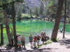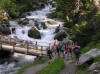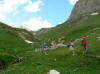 Jean Claude a prévu le tour du Grand Serru.Une route tortueuse nous conduit vers la vallée étroite, au lieu dit les Granges à 1750 m d’altitude où nous laissons les minibus. Dés les premiers pas nous sommes envoûtés par la majesté de cette vallée. Nous suivons le sentier et cernés de tous cotés par une extraordinaire forêt de mélèzes nous atteignons le petit pont de bois qui traverse le torrent impétueux. Progressivement nous atteignons le vallon supérieur à travers une pelouse alpine en pleine floraison. Pierre, notre botaniste photographe complète sa collection de photos de fleurs. Ce vallon est aussi appelé Petites Dolomites par son aspect minéral et désertique presque lunaire, grandiose.