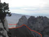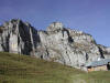 Le large chemin en forêt aborde la montée en douceur et permet de s’échauffer avant de « prendre de la pente ». Le Nant d’Alex coule en contrebas, vif et sinueux. Comme toujours la musique de l’eau, qu’elle soit torrent, cascade ou source discrète, ajoute une dimension au charme du paysage. Entre les arbres assez dénudés on aperçoit successivement, sous différentes facettes, à gauche les hauts rochers crénelés des Grandes Lanches, à droite ceux des Dents de Lanfon dont les découpes irrégulières incisent l’azur. Lorsqu’un sympathique panneau souhaite la bienvenue dans les alpages de Haute-Savoie, nous ne tardons pas à atteindre le premier chalet de l’Aulp-Riant. Les magnifiques pâturages inondés de soleil s’élèvent de part et d’autre vers les montagnes. Eblouis par cette lumière soudaine, nous découvrons droit devant le Roc de Lancrenaz (1768m) planté là-bas au-delà du second chalet que nous ne voyons pas. L’air est délicieusement doux, la température des plus agréables. Un peu plus haut, voici le col des Frètes (1645m). En bifurquant à droite et délaissant le Lanfonnet, après la traversée d’un coteau couvert de framboisiers, la vue plonge sur le lac d’Annecy (côté petit lac) d’un bleu parfait. Aucune brume importune n’entrave la visibilité sur les Bauges et plus loin vers la Chartreuse. Au premier plan, la montagne d’Entrevernes et le Roc des Bœufs splendides dans leur tenue d’automne. Entre certitudes et hésitations, nous reconnaissons les principaux sommets. Le sentier remonte vers les Dents de Lanfon et vient en butée contre leur dernier rocher à environ 100m de son sommet. De cette ligne de crête, on peut observer derrière le Lanfonnet l’énorme Tournette (2352m) et tout au loin, c’est bien lui, le Mont Charvin avec lequel nous partageons de si bons souvenirs !...