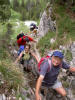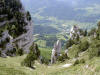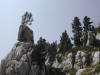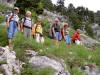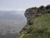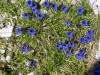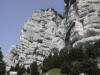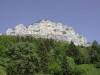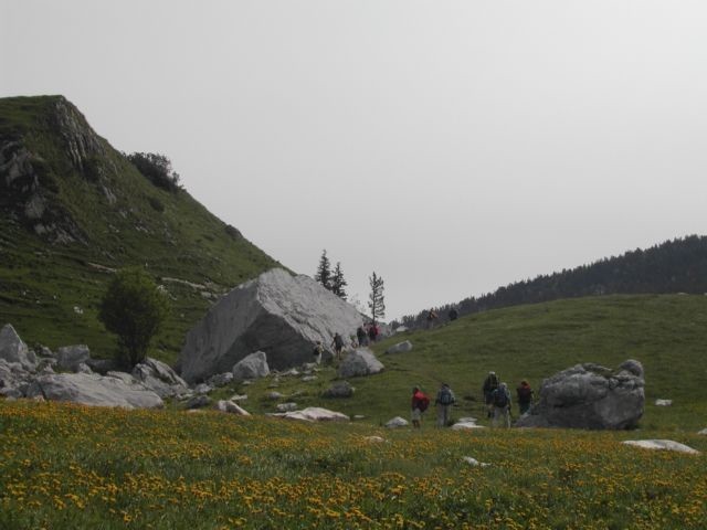 Après les crocus, les pensées, voici les trolles, le lotier, le myosotis, les primevères farineuses, les primevères auricules, les anémones, les orchis jaunes ou violettes, les lys de St-Bruno… et cette guirlande mauve dans un sapin : une clématite sauvage. En approchant des falaises, notre avancée se poursuit en crapahutant un peu, aidés de barreaux et de câbles. Un parcours sportif tout de même qui met du piquant sans présenter de réels dangers, les roches n’étant pas humides. Dans l’air très frais de ce matin du 8 juin 2005, environnés de barres rocheuses aux découpes parfois étrangement régulières, nous goûtons le charme de cette Chartreuse : sentiers délités parcourant une végétation riche et variée, étendues de lapiaz plus ou moins comblés, remparts de calcaire coiffés de sapins et percés de grottes mystérieuses, hauts murs aux failles inquiétantes et imprévisibles. Des globulaires à foison maquillent de bleu pâle la verdure tandis que les gentianes, reines du printemps, généreuses et lumineuses tissent en maintes places de luxueux tapis.