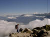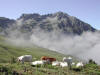 Le ciel est clair mais en arrivant vers Montmélian une épaisse couche de nuages couvre les sommets. A la chapelle de Prodin le moral et la température sont au plus bas. Qu’à cela ne tienne nous démarrons doucement par la piste forestière et là surprise notre ami Robert trouve un petit carré de chanterelles ! Et la chance continue car au détour du chemin le brouillard se lève et nous apparaissent sur le ciel d’azur les crêtes décharnées des Grands Moulins, sommet de 2500m dont le décor minéral et désolé nous emplit de bonheur. Petit arrêt aux refuges des Platières et déjà nous sommes au col de La Perche. Encore une heure et la croix du sommet se détache sur le ciel bleu. Une table d’orientation nous indique les noms des sommets environnants. Nous décidons de redescendre au col ou nos amis nous attendent dans un trou de verdure.