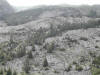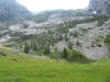 Le sentier se faufile dans la verdure et les éboulis. Dans les vastes étendues rocheuses dont les pentes s’étalent très bas, l’érosion a dessiné d’étranges lapiaz aux formes ondulantes. Vue de loin, cette surface est une peau de pierre grise et ridée.