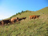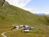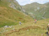 Nous redescendons vers Praz Plan afin de poursuivre notre périple dans ces paysages grandioses au relief qui n’engendre pas la monotonie ! Tantôt perdant de l’altitude vers un vallon aux formes arrondies, pour en regagner soudain en une grimpette fort raide dans l’herbe épaisse où une multitude de grosses sauterelles trouvent leur bonheur. Et au-delà, encore des alpages vallonnés qui se rejoignent par des chemins escarpés, d’un côté protégés et dominés par de hauts rochers formant écrin, de l’autre, semblant se précipiter vers la vallée profonde. Ca et là, épousant le terrain, quelque discret refuge maintenu en bon état, dont une partie de la toiture affleure le sol : il est prêt à affronter toutes les intempéries, en particulier les abondantes chutes de neige. Dans ces prairies d’altitude, les jolies tarines sont reines. Nous en observons tout un troupeau au loin, redescendant à vive allure d’un flanc de montagne. Agiles et joyeuses, en plein après-midi elles se rapprochent de leur lieu de traite.