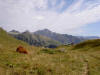 D’abord la forêt et bientôt d’immenses alpages plus que vallonnés ! Quelques vaches ne tardent pas à nous accompagner un bout de chemin, offrant leur concert de clarines. Et l’on grimpe dans la verdure, sous le chaud soleil, en terrain parfois copieusement enrichi par ces dames à quatre pattes. Nous prenons encore un peu d’altitude jusqu’au hameau de Praz Plan, non loin de la Roche à Thomas (2398m). Un peu plus au nord s’élève le Crêt du Rey (2639m). Quelques chalets dominent les vastes pâturages. Paul nous fait visiter le sien. Cette montagne est son domaine. Il la connaît par cœur pour y avoir passé autrefois de nombreux étés avec les troupeaux. Nous poussons jusqu’à la croix, tout au bout de la butte. Au-delà de la vallée, droit devant, le Mont Pourri (3779m) un peu enneigé, de part et d’autre les sommets des stations de la Plagne, des Arcs et plus au Sud, les glaciers de la Vanoise avec le Dôme de Chasseforêt (3586m) et la Pointe de la Grande Casse (3852m).