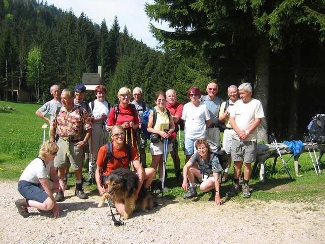 Un peu plus loin, Pierrot, notre botaniste nous montre la différence entre la Cardamine blanche - à 7 feuilles - et la Cardamine violette - à 5 feuilles. Le chemin se poursuit en sous-bois, la pente est rude. Pour une première sortie cette année Marie-Thé est servie ! Heureusement l’allure est raisonnable bien que soutenue. Enfin nous atteignons un pré verdoyant, Les Granges du Planet, à 1180 mètres, carrefour de randonnées à 100 mètres du col du Planet. Petite restauration et partage de fruits secs. On resterait bien là, hein Marie- Thé ? Mais non, mais non. Le groupe repart pour les derniers 230 mètres de dénivelé.