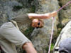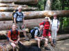 Une clairière où les forestiers ont aligné une impressionnante quantité de troncs d’arbres nous accueille pour une courte halte. Distribution de bonbons avant le presque dernier effort de la matinée. Traversée en sous-bois un peu boueux et soudain se dresse devant nous le rocher de Corbeley. Allez, on laisse là sacs et bâtons sous la vigilance de Marie-Thé et on se lance dans l’escalade. Eh ! C’est même amusant ! Jean-Claude a néanmoins pris la précaution de fixer une corde à un arbre ; elle servira peu à la montée mais on l’appréciera à la descente. L’espace au sommet étant réduit, on se divise pour gravir les derniers mètres et admirer à tour de rôle, la vue sur la vallée : au Sud Saint Laurent du Pont et au Nord, le Lac du Bourget. Ce n’est pas tout de faire la dent, mais du coup on a les crocs ! On a failli attendre le Clinton ! De la salle à manger, vue sur le Mont Joigny, les crêtes de la Drière, le Granier, Le Pinet.