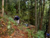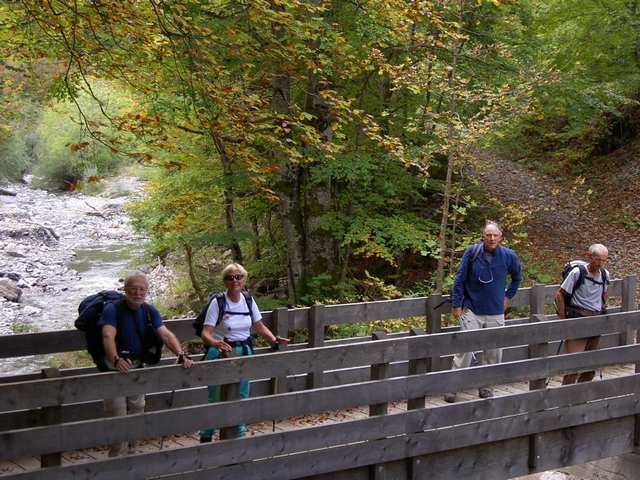 La première dépression d’automne est passée sur la France nous obligeant à décaler notre sortie au jeudi et ce n’est que 5 valeureux marcheurs qui prennent la direction des Bauges .Il n’y a guère de voitures au Nant Fourchu. Nous décidons de rejoindre le Grand Roc par le sentier de la boucle de Combefort qui monte en lacets très serrés le long du ruisseau de la Fougère. Après deux heures d’efforts nous arrivons au pied des barres rocheuses qui défendent le Grand Roc. Là, nous rencontrons des chasseurs accompagnés de gardes de l’ONF. Ils nous expliquent le passage à travers les barres rocheuses pour rejoindre le sommet , mais celui-ci est si mouillé que nous préférons, après le casse croûte, redescendre et rentrer par les chalets de Combefort. Petite sortie mais, quand même 6h de marche et 950m de dénivelé!!.