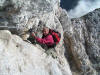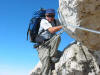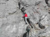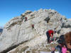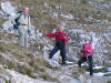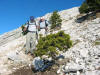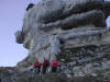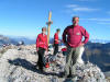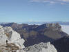 Sur le sentier en forêt, la boue et le verglas font le pas prudent. Ca et là persistent des dernières précipitations quelques plaques de neige. Mais bientôt nous arpentons les coteaux lumineux où l’herbe rousse et les bouquets de sapins cèdent de plus en plus la place aux roches calcaires. Tout en haut, la blanche Chamechaude resplendit au soleil. Six membres du groupe prennent le chemin qui contourne l’immense rocher afin de gagner le sommet par la cheminée. Nous sommes trois à poursuivre vers la crête. En haut du grand pierrier, Daniel et Pierre, les premiers arrivés par la cheminée, viennent apporter encouragement et conseils pour l’ascension finale, impressionnante mais bien sécurisée par un câble. Du sommet à 2082m, la vue porte loin ; au-delà des Bauges, on distingue nettement la Pointe Percée et le Mont Charvin. Le Mont Blanc parfaitement dégagé semble proche. La chaîne de Belledonne et le Vercors gardent les pieds dans les nuages, tout comme la Dent de Crolles au premier plan.