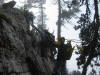 Les derniers rayons de soleil traversent là haut la cime des arbres. Après un regard vers ces belles falaises maintenant légèrement embrumées, nous regagnons la forêt par la combe étroite et pentue dont les lacets finiraient par donner le tournis. Décidément, un itinéraire de retour qui ne ressemble à aucun autre !
