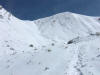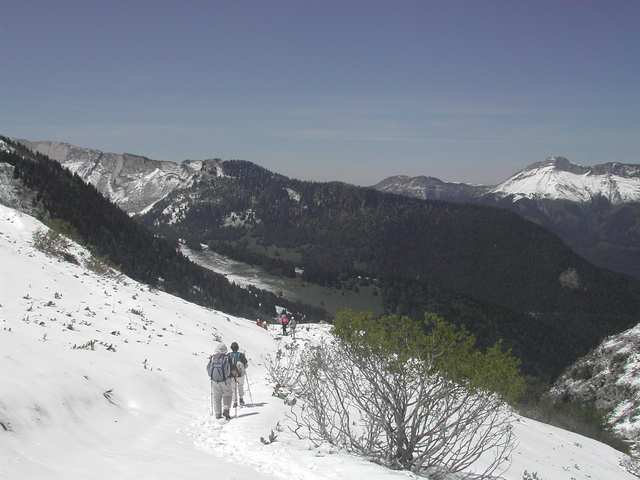 La luxuriante végétation se fait de plus en plus blanchissante. Arrivés dans l’Alpage d’Armenaz, nos pas pénètrent une épaisse couche de neige immaculée, craquante et scintillante où seuls quelques chamois nous ont précédés. Spectacle insolite que celui des feuilles de grandes gentianes et des têtes jaunes de trolles émergeant, prisonnières de ce tapis glacé. Compte tenu de l’enneigement, pas question d’atteindre le sommet. Seuls Pierre et Robert pousseront jusqu’au col.