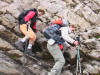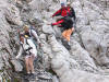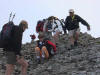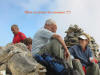 Le sentier s’élève gentiment à l’ombre au-dessus du petit lac. Ses lacets conduisent là-haut, vers le soleil, sur un dernier replat de verdure où quelques moutons nous ont précédés. Nous pénétrons alors le monde minéral et imposant des Aravis : immense pierrier dominé de hauts rochers magnifiquement taillés et sculptés par Dame Nature. La rudesse de la pente n’entame pas notre enthousiasme et chacun aborde comme il peut, mais avec succès, la dernière escalade pour le sommet ! Mais la brume est montée de la vallée opposée. Nous serons privés de Mont Blanc ! Belle vue tout de même vers le Trou de la Mouche et la Pointe Percée.