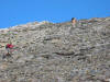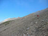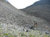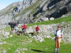 Après le pique nique (au frais…), descente prudente de notre perchoir (alt.2537m) vers une autre combe, tout aussi encombrée d’éboulis que celle de la montée, où un névé surprend un pas trop assuré … ! Enfin nous retrouvons avec plaisir les alpages pour une pause bien méritée, en compagnie de nos amies les vaches.