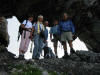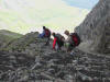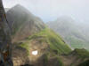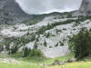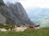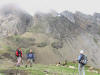 Nous atteignons le Trou de la Mouche par la combe du Grand Crêt, en suivant les cairns dans le pierrier. Des troupeaux de moutons et une horde de chamois nous accompagnent pendant toute la randonnée. Une variante au sommet, nous escaladons les derniers mètres avec prudence dans une cheminée, les bâtons accrochés au sac. Malheureusement, du haut de nos 2467m, la brume est au rendez-vous : nous distinguons mal le Mont Blanc.