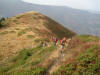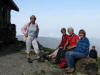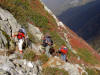 Tout le monde se retrouve sur le chemin du retour au replat de l’Oule (alt.1720m). Les plus curieux et gloutons de dénivelés décident de revenir par un autre chemin. Il leur faut d’abord regagner 300m d’altitude. Une bonne heure de grimpette assez raide. Que du bonheur !... surtout en approchant la croix du Léat (surplombant le petit lac du même nom). Ils ont alors la surprise de découvrir un paysage féérique. Un épais et vaste tapis de rhododendrons mêlés aux myrtilles flamboyantes, forme un tableau chamarré face au glacier. Sublime ! Les photos donnent quelques regrets à ceux et celles qui ont eu peur de fatiguer inutilement leur mollets !