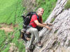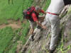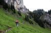 Un sentier bien empierré nous conduit directement aux Chalets de La Balme en une heure de marche. Puis un groupe part vers la gauche direction montagne Sur Cou tandis que l’autre groupe grimpe les prés au dessus des bâtiments pour rejoindre le sentier vers la droite jusqu’à une petite barre rocheuse. C’est le " Pas de la Truie" ou "Passage du Câble". Ce court passage équipé de câbles et de marchepieds demande la plus grande vigilance, surtout aujourd’hui : la roche est très humide. Informations sur la falaise : hauteur minimale 140m, hauteur maximale 200m.