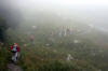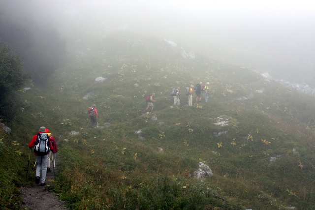 En ce moment, même lorsque la météo annonce beau temps, le brouillard ne désarme pas. Il s’imposera toute la matinée de ce 23 septembre 2008 jusqu’à plus de 2000m d’altitude. Belle balade malgré tout dans la verdure et les rochers, en imaginant la beauté de ce site prisonnier de ses voiles. Peu avant le col d’Anterne (2257m), un coin de ciel bleu nous réjouit. La Tête de Moëde (2459m) garde sa tête dans les nuages. Ceux qui l’arpenteront ne seront pas récompensés : Les hauts sommets d’alentour restent invisibles ainsi que les vallées.