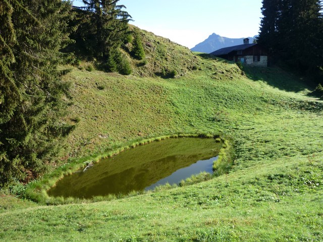 Nous garons la voiture dans le premier lacet aux chalets des Granges et suivons le sentier sinueux dans la forêt jusqu’aux Chalets des Chenalettes (petit étang) puis aux Chalets de Plan Villard 1546m , quarante minutes… répèterons nous souvent !!