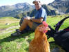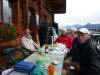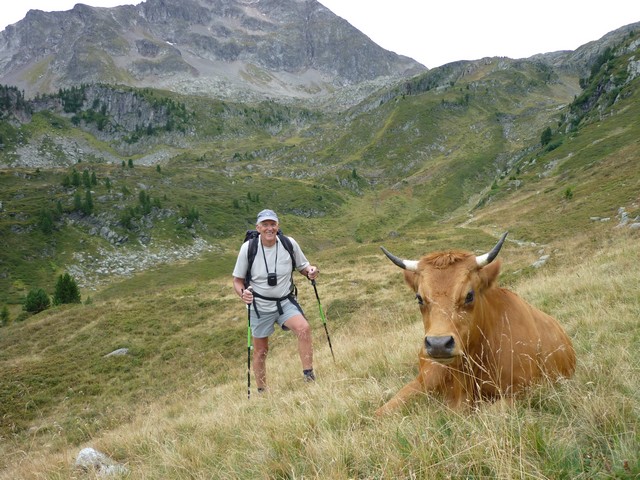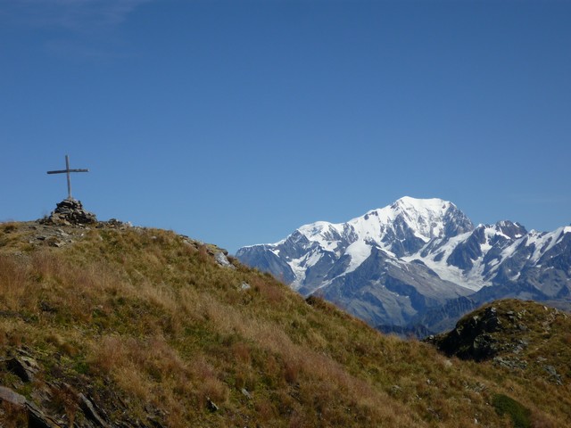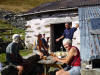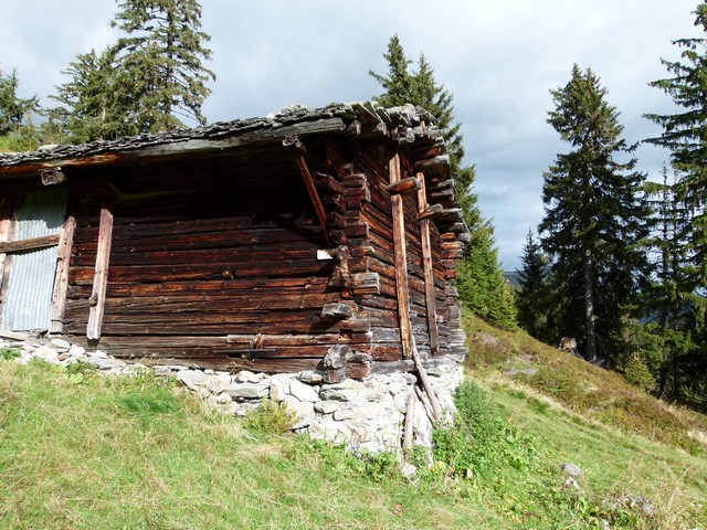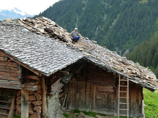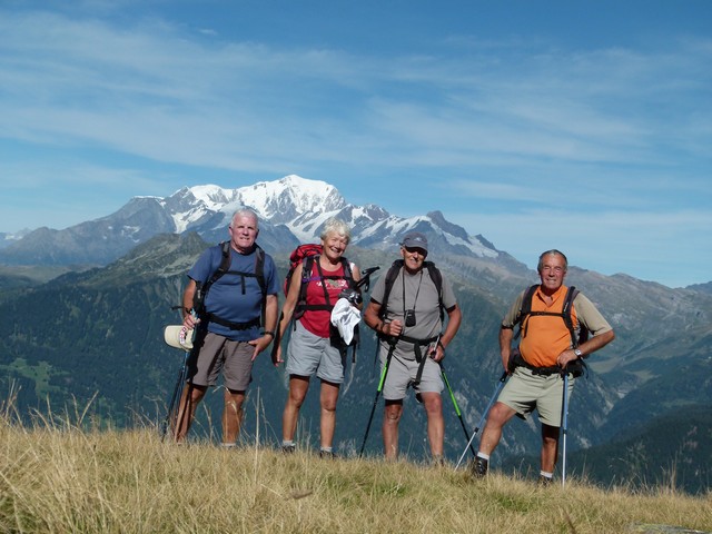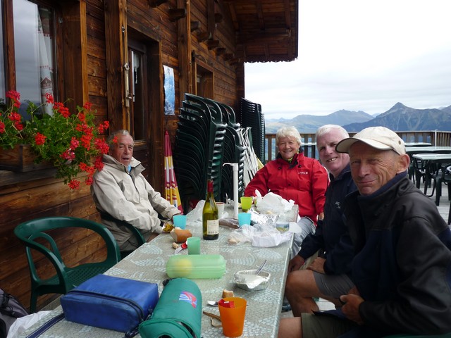 Nous prenons la direction du refuge des Arolles (1940m) par les Combettes ; une première halte au pied de deux beaux chalets rupestres perdus dans les prairies. Là un authentique alpagiste rénove le toit de sa bergerie .Plus haut, les deux Pierre et moi nous nous dirigeons au refuge des Arolles tandis que Paulo et Robert poursuivent jusqu’aux lacs Brassa et Tournant, un long cheminement dans les cailloux et la prairie. A 12h30, les voilà de retour, nous profitons de la terrasse des Arolles face au Mont Blanc pour déjeuner ensemble. Puis retour par Nerchar avec une petite cueillette de girolles.