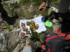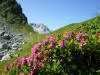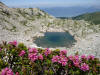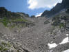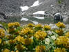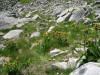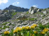 De gros pierriers, des jolies dalles rocheuses et de nombreux cairns et marques jaunes nous conduisent au petit Lac Vert niché dans son trou, entouré de gentianes ponctuées.