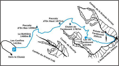 Sous une chaleur estivale nous empruntons facilement la combe de Paccaly, puis le sentier devient plus raide et emprunte une succession de vallons herbeux avant d’arriver à une petite combe où se niche le lac de Tardevant. Les plus courageux poursuivent à L’Ambrevetta et à la Pointe de Tardevant où la vue plongeante est saisissante ... les efforts fournis sont vite oubliés. Encore un grand bravo à Marie Claude qui, sans entraînement, par sa ténacité et sa persévérance a suivi « les Grands » à 2501m !!!