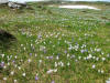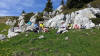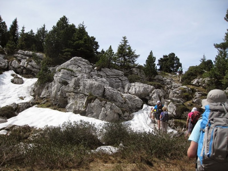 Nous sommes conquis par le site verdoyant et chaotique de la Chartreuse, riche en fleurs. Globulaires, soldanelles, gentianes printanières, pensées des Alpes, gentianes de Kok, joli bois…. En approchant du col, des névés encore épais recouvrent les lapiaz et les parois des gigantesques entonnoirs creusés dans le calcaire. De luxueux tapis de crocus nous accueillent à l’approche du vaste plateau d’alpage (altitude moyenne 1700m) où un petit vent nous rafraîchit près de la Croix de l’Alpe (alt. 1821m).