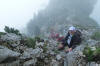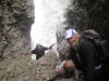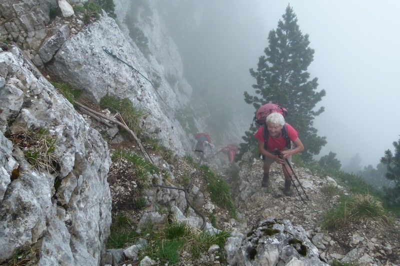 Départ du col de Plainpalais pour cinq Clinetorandes. Marie Claude se « tartine » de crème solaire …alors qu’un brouillard dense nous envahit…. Nous nous enfonçons dans les bois boueux (il a plu la veille) pour sortir au pré des Carres dans une prairie regorgeant de fleurs : muguet, renoncules, gentianes, lis de Saint Bruno, compagnons rouges,linaires des alpes, églantines etc.…Le sentier s’élève rapidement dans les pierriers pour arriver au pied de la paroi. La deux possibilités ; comme l’homme est d’une nature curieuse, il veut tout voir …nous grimpons à droite dans un cirque, escaladons une vire rocheuse qui s’élève tantôt à gauche tantôt à droite jusqu’à l’entrée de la grotte. Bébert repère les lieux il faudrait se hisser une fois de plus sur des rochers glissants surplombant le vide… Nous sommes alors à 150 m du sommet…Pas de risque …demi tour pour le passage de la crevasse, sur une avancée rocheuse au dessus d’une falaise où nous pénétrons le défilé par une échelle, suivons son fond jusqu’à sa sortie au dessus du trou de l’Agneau toujours plongée dans le brouillard. Nous entendons les appels des trois Clinetos, partis de la place de Baban , mais impossible de se voir. Après plusieurs SMS échangés, les deux groupes ne se réuniront pas pour le pique nique.