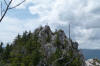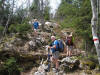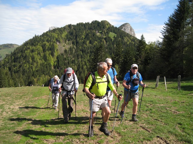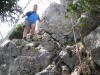 Du panneau, nous partons à droite , entrons dans le bois et attaquons la croupe herbeuse . Celle ci devient de plus en plus rocheuse et accidentée: de belles vues sur les montagnes baujues. Parvenus à l'antécime, descendons à un collet par une petite varappe, remontons quatre varappes pour atteindre l'arête finale rocheuse et déchiquetée.