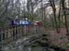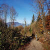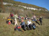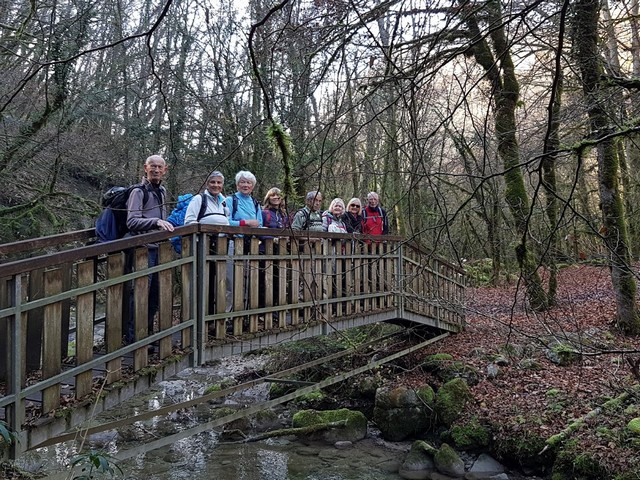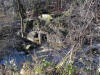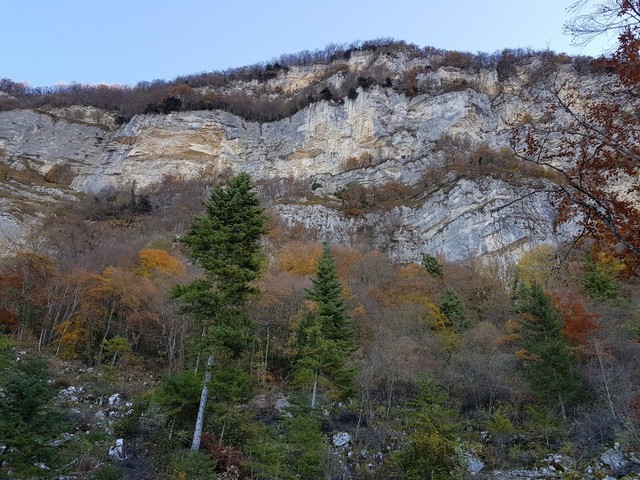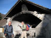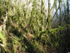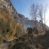 Nous descendons par une ruelle qui s'ouvre entre la croix et la buvette ;en contrebas un ancien moulin occupe les lieux .Nous remontons vers le village de Vercra. Pas très loin de nous la centrale du Bugey crache sa vapeur. Puis une piste longe une vigne- quelques sartos subsistent encore- pour se transformer en sentier parallèle au cours de la Brivaz. La végétation est enveloppée de guirlandes de lichens. Marie Claude et Françoise se confectionnent de superbes perruques et moustaches.
