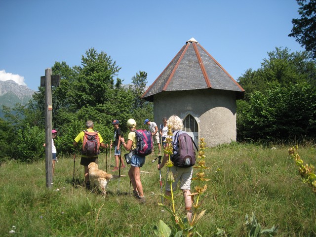Quatre participants au départ d'Ecole; par une montée ombragée, via la magnifique chapelle Saint Bernard,nous atteignons les chalets de la Fullie. Au bout de 735m de dénivelée, nous posons nos sacs , à l'ombre des sapins...dans la rosée.
