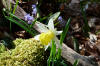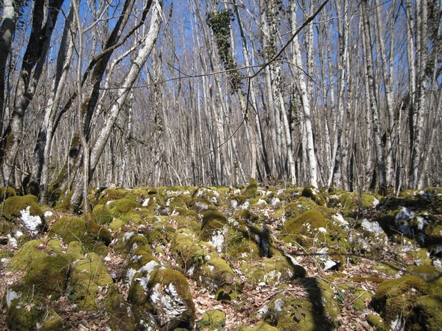 Au départ de Chavanne, nous atteignons la croix et les ruines de l'église Saint André dominant l'albanais. Nous entamons une longue montée régulière, avec de très beaux points de vue sur le défilé du Fier et traversons une zone de lapiaz boisée, parsemée de jonquilles et érythrones pour arriver dans les prés de la ferme du Comte baignée de scilles à deux feuilles.
