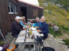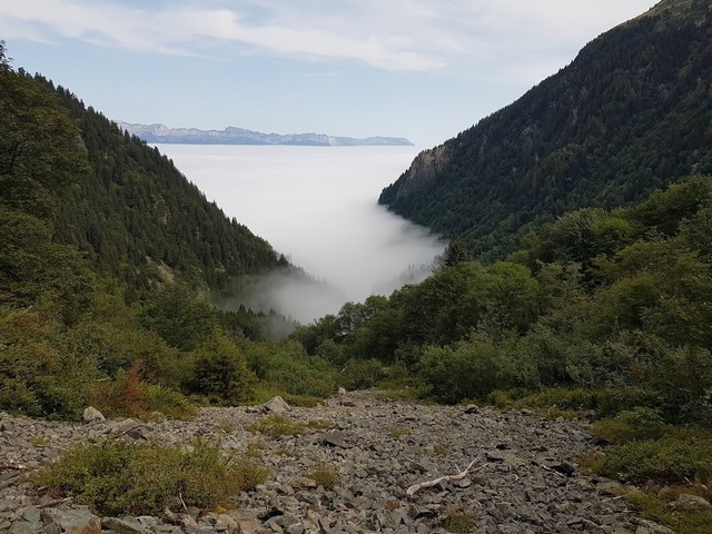 Départ à 8h20 sur un sentier facile en forêt, puis montée plus pentue au dessus des nuages de brumes jusqu'au refuge à 1950m. Bon accueil au refuge et déjeuner autour de diots polenta, omelette au fromage, etc, avec une bière artisanale locale, un côte du Rhône, et pour finir un Gewurztraminer de 2003 ! apporté par Daniel pour arroser ses 27 ans autour d'un excellent gâteau aux figues préparé par Mme Lugand.