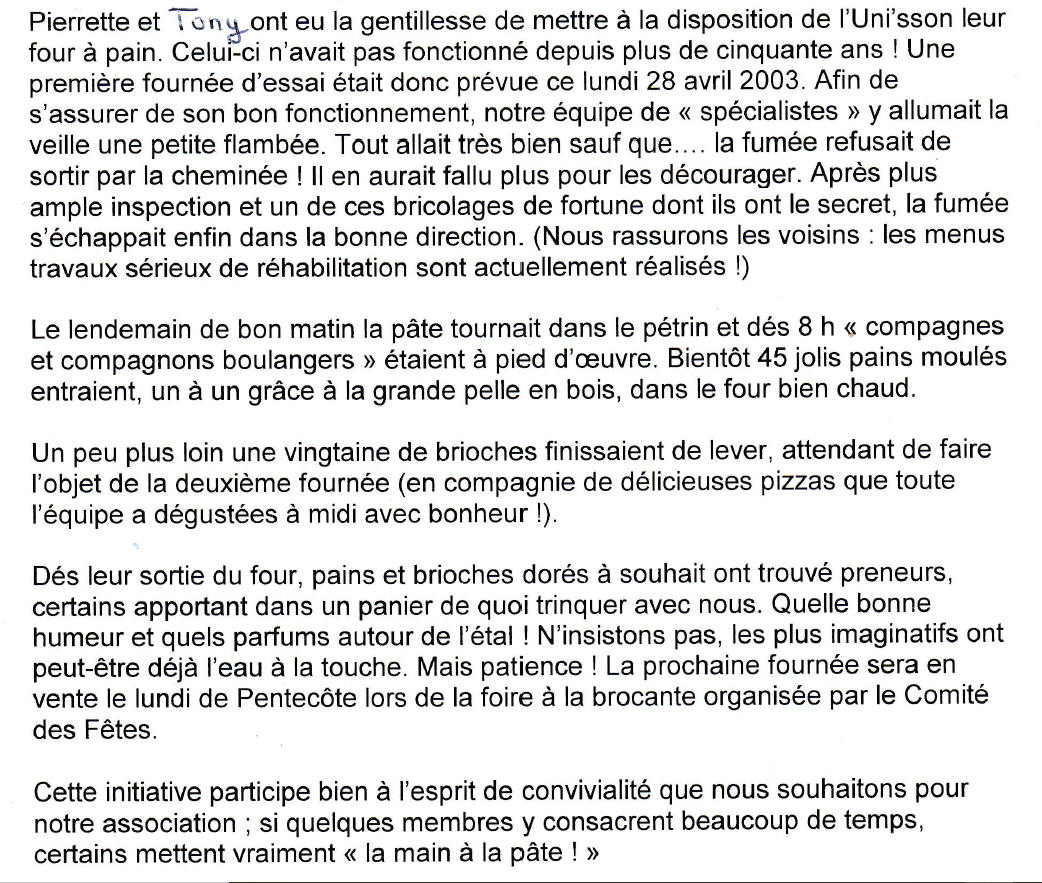 Une idée germa : pourquoi ne pas les faire revivre… pour la grande joie des anciens ! Le four reprit donc du service. Et pendant de nombreuses années, une centaine de personnes se retrouvent devant la chapelle (restaurée grâce aux bénéfices de cette initiative) sous un chapiteau pour une célébration et pour déguster pains, pizzas, tartes etc…