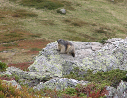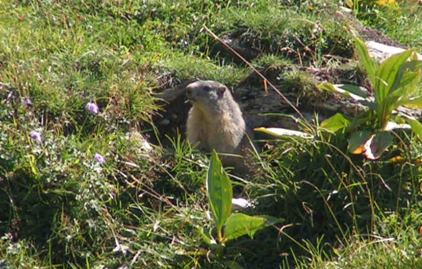 La marmotte, mammifère herbivore, est un très gros rongeur vivant dans les Alpes entre 1 000 et 3 000 mètres. Elle mesure de 60 à 98 centimètres, vit sur les versants ensoleillés des alpages, au milieu des gros blocs de pierres et des éboulis. Les marmottes sont des hibernants. A l'approche de l'automne, elles aménagent un terrier terminé par une chambre tapissée de foin. C'est là que la famille passera l'hiver. Dès le mois de septembre ou début d'octobre, les marmottes obturent l'entrée du terrier puis s'endorment jusqu'au mois d'avril.