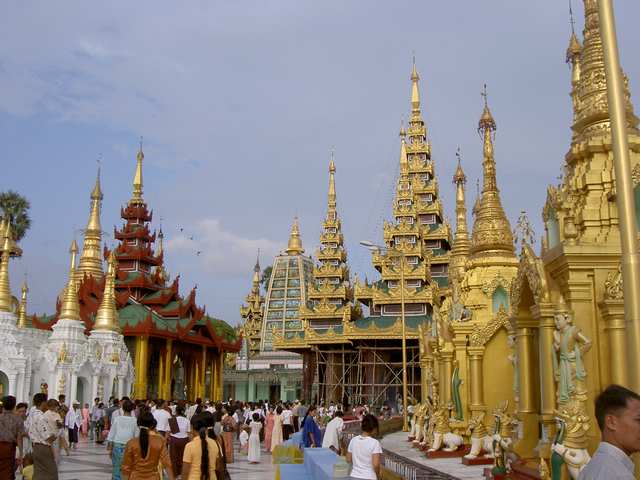 A Yangon (anciennement Rangoon) dominant le faîte des arbres se dressent des stupas miroitants. L’étincelante paya Shewdagon (hauteur 98m) est le temple le plus sacré du pays. Le soleil couchant dardant ses derniers rayons sur son dôme jaune orangé offre un spectacle féerique. Ce « dragon d’or » joyau du Myammar nous ensorcelle .